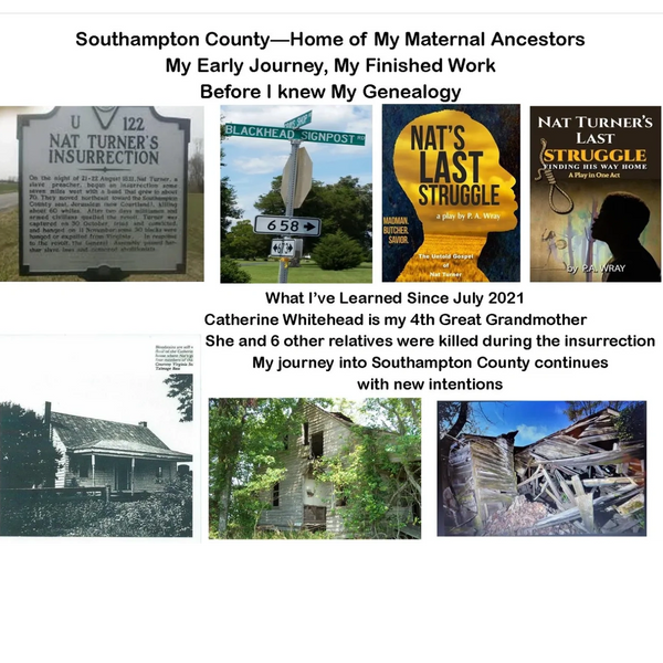 My call to write about Southampton has been an interesting journey. It focused my work on history. In July 2021, the call became intense when I learned of my genealogy, that I'm a descendent of Catherine Whitehead, whose farm was attacked during the slave rebellion. She, and six other relatives, were slain. I had written my play on Nat Turner in 2008, 13 years before. It has played across the country getting rave reviews since. I began to wonder if I would've written the play the same way had I known about Catherine. Months later after finding out more about my family, especially the one who survived and what happened to her - I'm glad I wrote about Nat the way I did, and I would do it again. There is an evilness about slavery and oppression, we have a right, and perhaps a duty - to rebel against it.